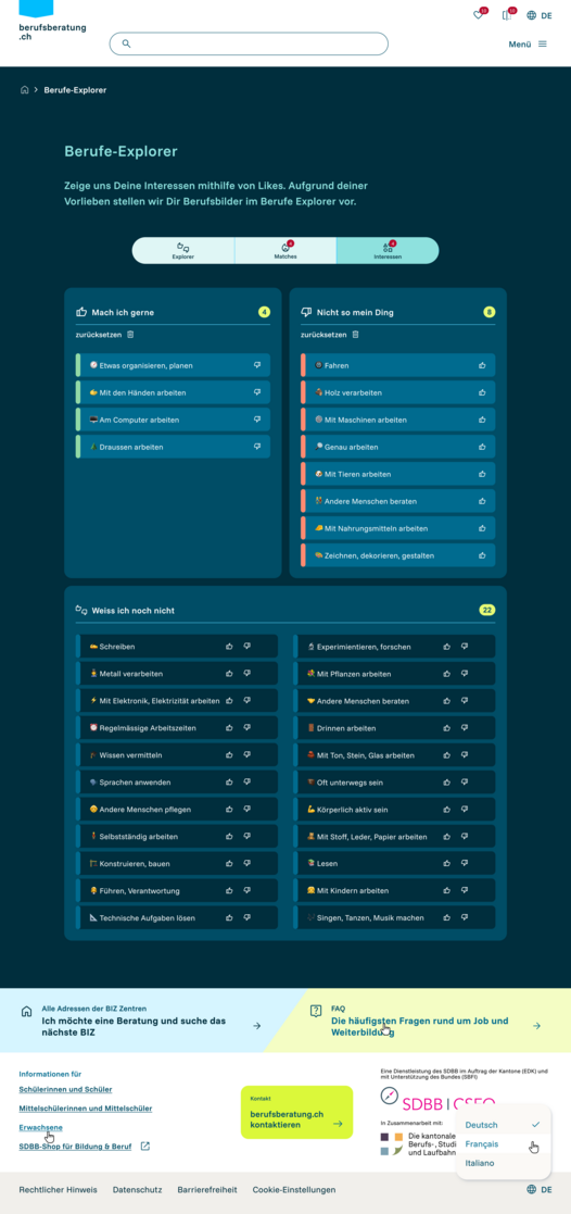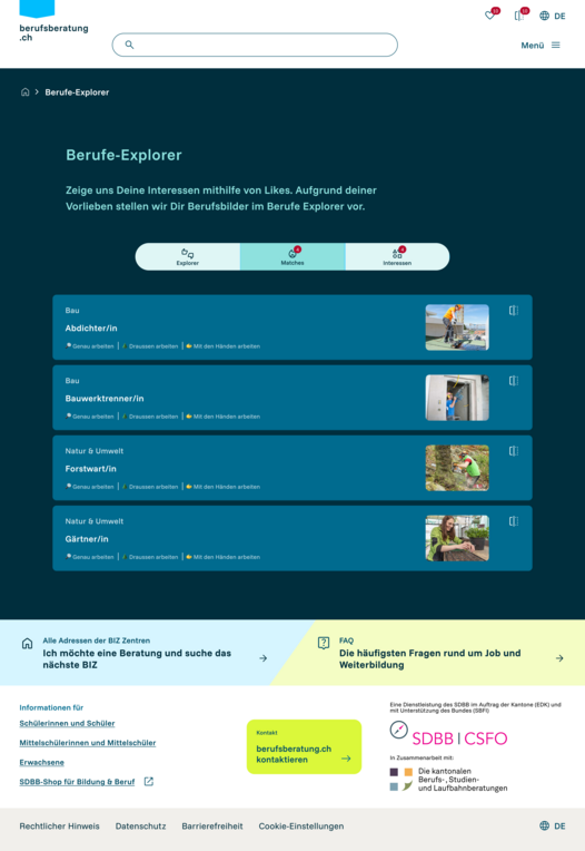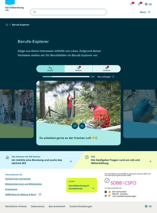 Februar 2026: Wir haben den Berufe-Explorer, ein zentrales Selbsterkundungstool von berufsberatung.ch, überarbeitet. Er wird neu aus den folgenden drei Bereichen bestehen: